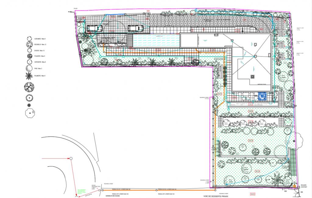 The 4 bedrooms property of approximately 300m² is on a plot of 1,600m² and includes a garage with direct access to the villa and a large parking area for up to 8 cars with a wide entrance. The unique natural stone facade was inspired by the Museum of Modern Art in Nice.